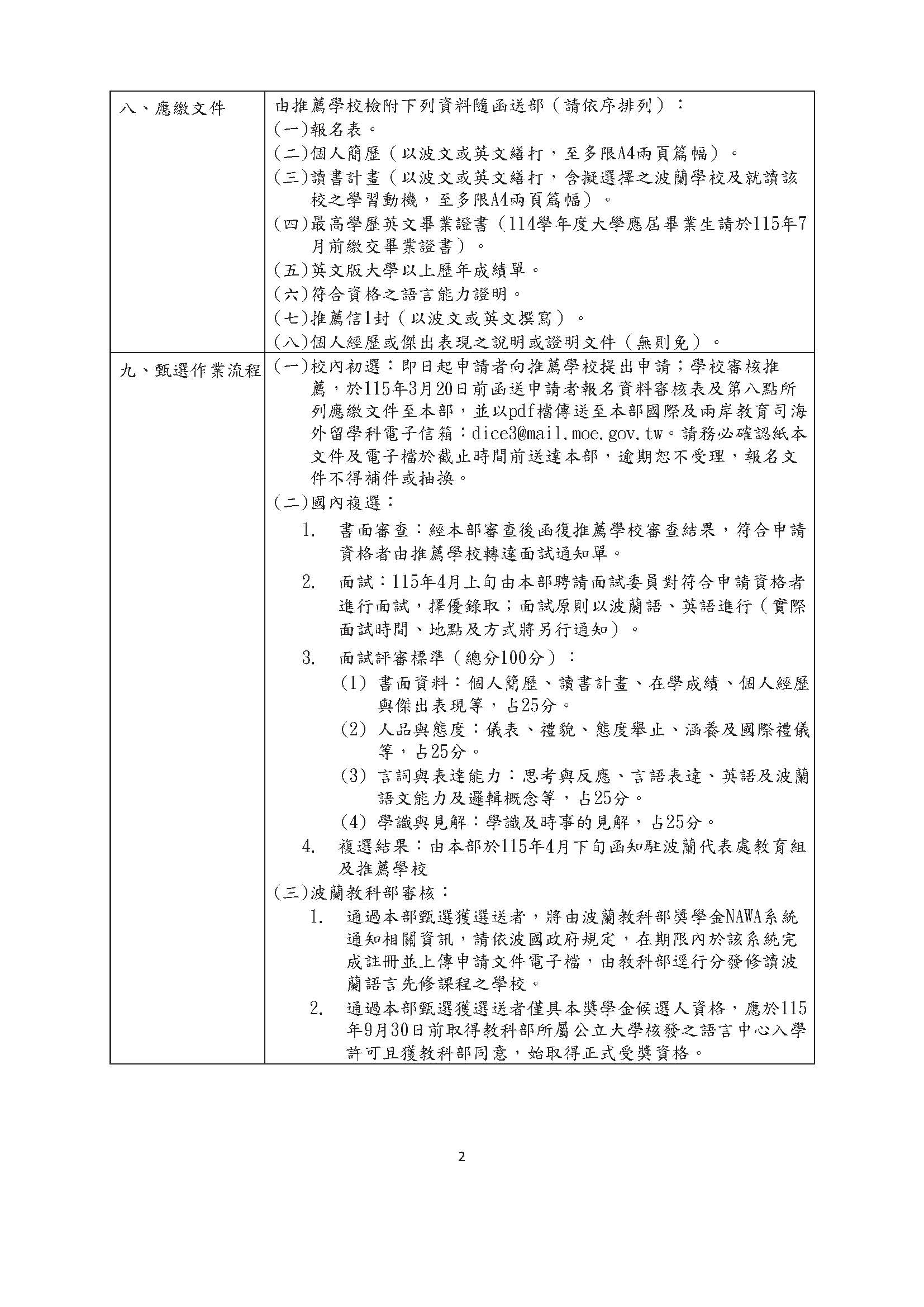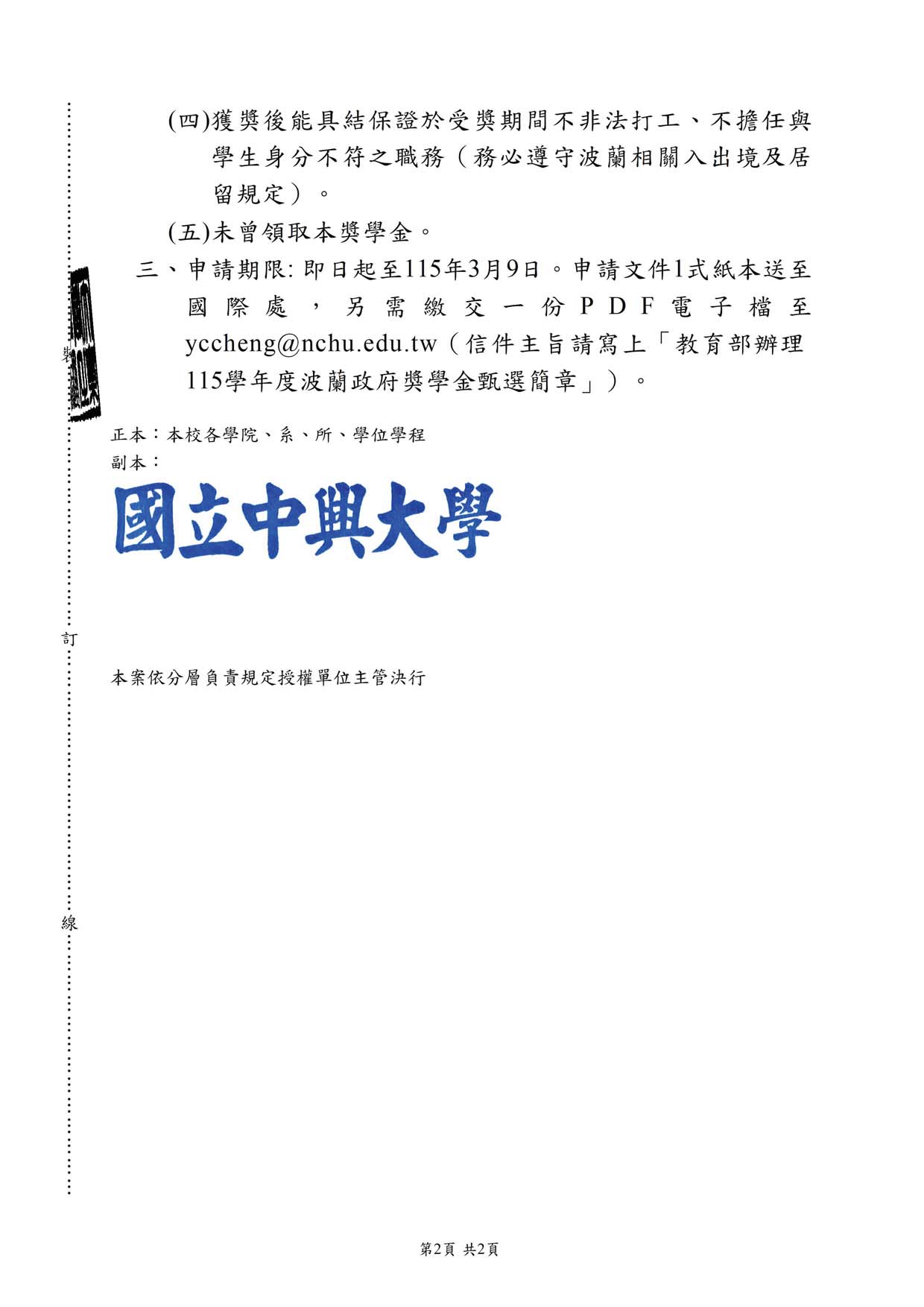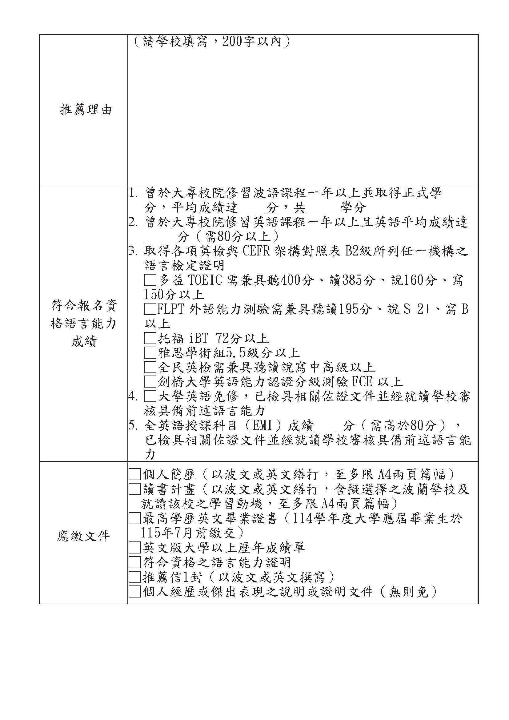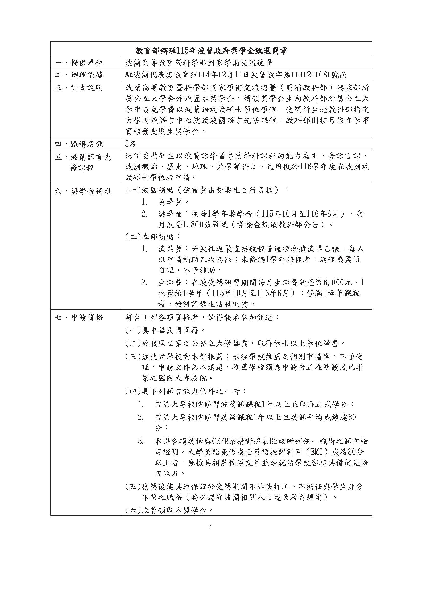 (一)具中華民國國籍。 (二)於我國立案之公私立大學畢業,取得學士以上學位證書。 (三)具下列語言能力條件之一者: 1、曾於大專校院修習波蘭語課程1年以上並取得正式學分者。 2、曾於大專校院修習英語課程1年以上且英語平均成績達80分者。 3、取得各項英檢與CEFR架構對照表B2級所列任一機構之語言檢定證明。大學英語免修或全英語授課科目 (EMI)成績80分以上者,應檢具相關佐證文件並經就學校審核具備前述語言能力。 (四)獲獎後能具結保證於受獎期間不非法打工、不擔任與學生身分不符之職務(務必遵守波蘭相關入出境及居留規定)。 (五)未曾領取本獎學金。 申請期限:即日起至115年3月9日。申請文件1式紙本送至國際處,另需繳交一份PDF電子檔至 yccheng@nchu.edu.tw(信件主旨請寫上「教育部辦理 115學年度波蘭政府獎學金甄選簡章」)。