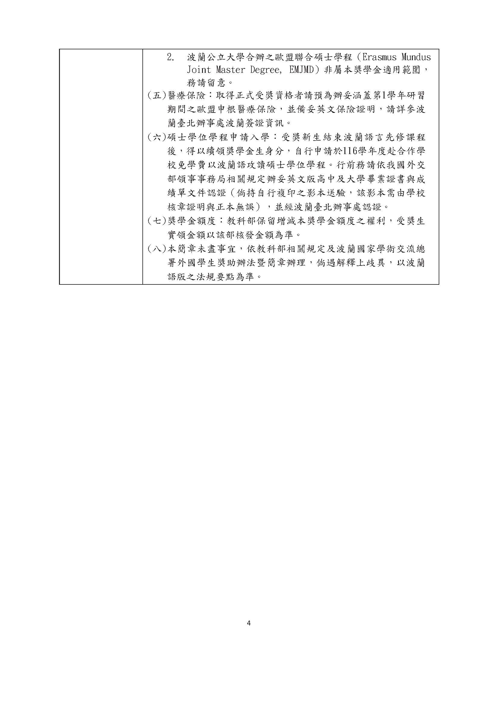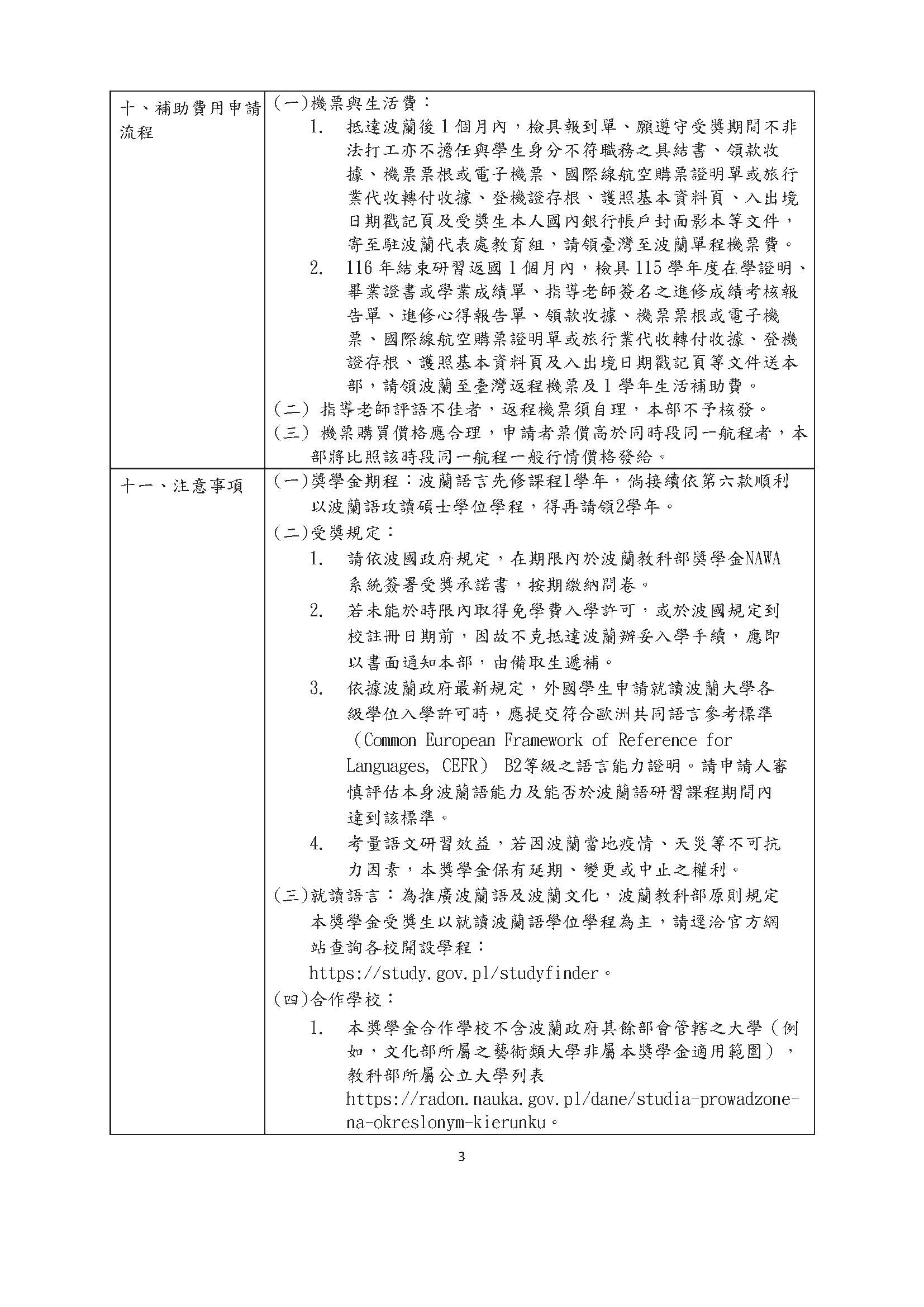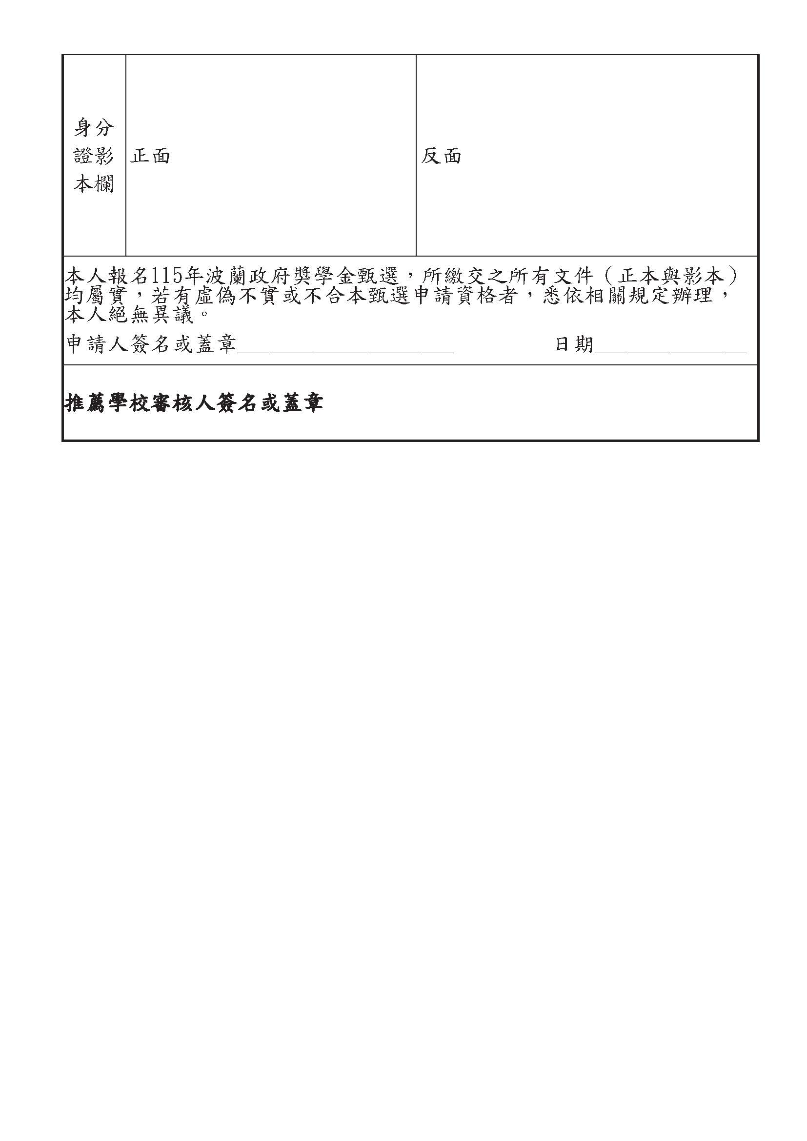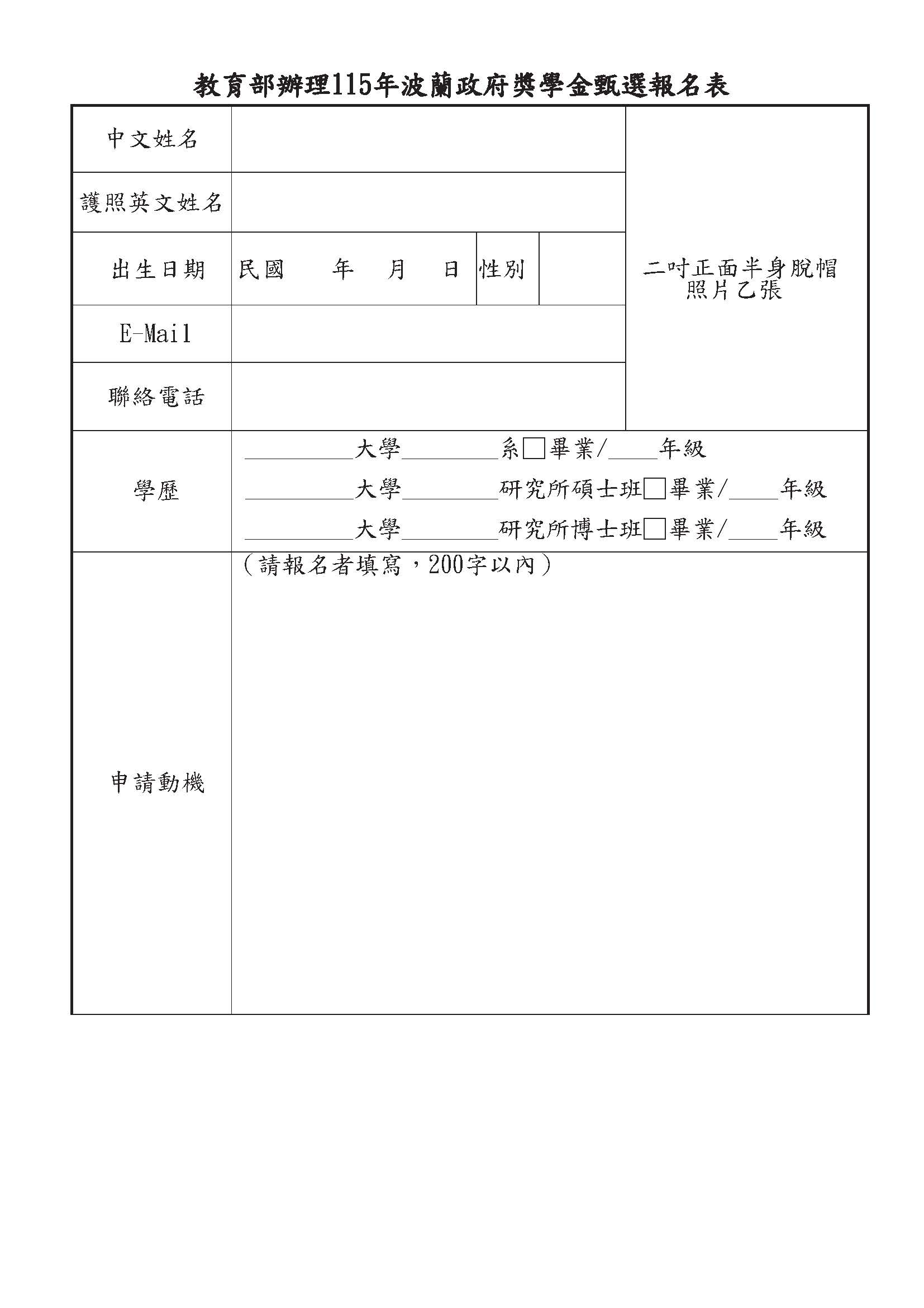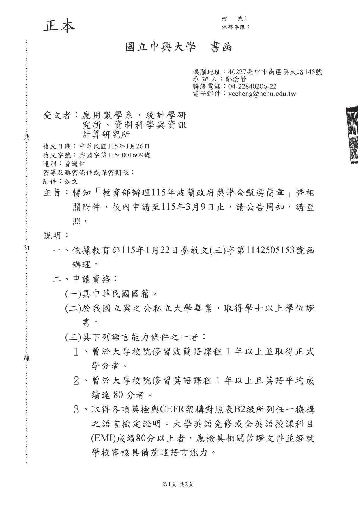 (一)具中華民國國籍。 (二)於我國立案之公私立大學畢業,取得學士以上學位證書。 (三)具下列語言能力條件之一者: 1、曾於大專校院修習波蘭語課程1年以上並取得正式學分者。 2、曾於大專校院修習英語課程1年以上且英語平均成績達80分者。 3、取得各項英檢與CEFR架構對照表B2級所列任一機構之語言檢定證明。大學英語免修或全英語授課科目 (EMI)成績80分以上者,應檢具相關佐證文件並經就學校審核具備前述語言能力。 (四)獲獎後能具結保證於受獎期間不非法打工、不擔任與學生身分不符之職務(務必遵守波蘭相關入出境及居留規定)。 (五)未曾領取本獎學金。 申請期限:即日起至115年3月9日。申請文件1式紙本送至國際處,另需繳交一份PDF電子檔至 yccheng@nchu.edu.tw(信件主旨請寫上「教育部辦理 115學年度波蘭政府獎學金甄選簡章」)。