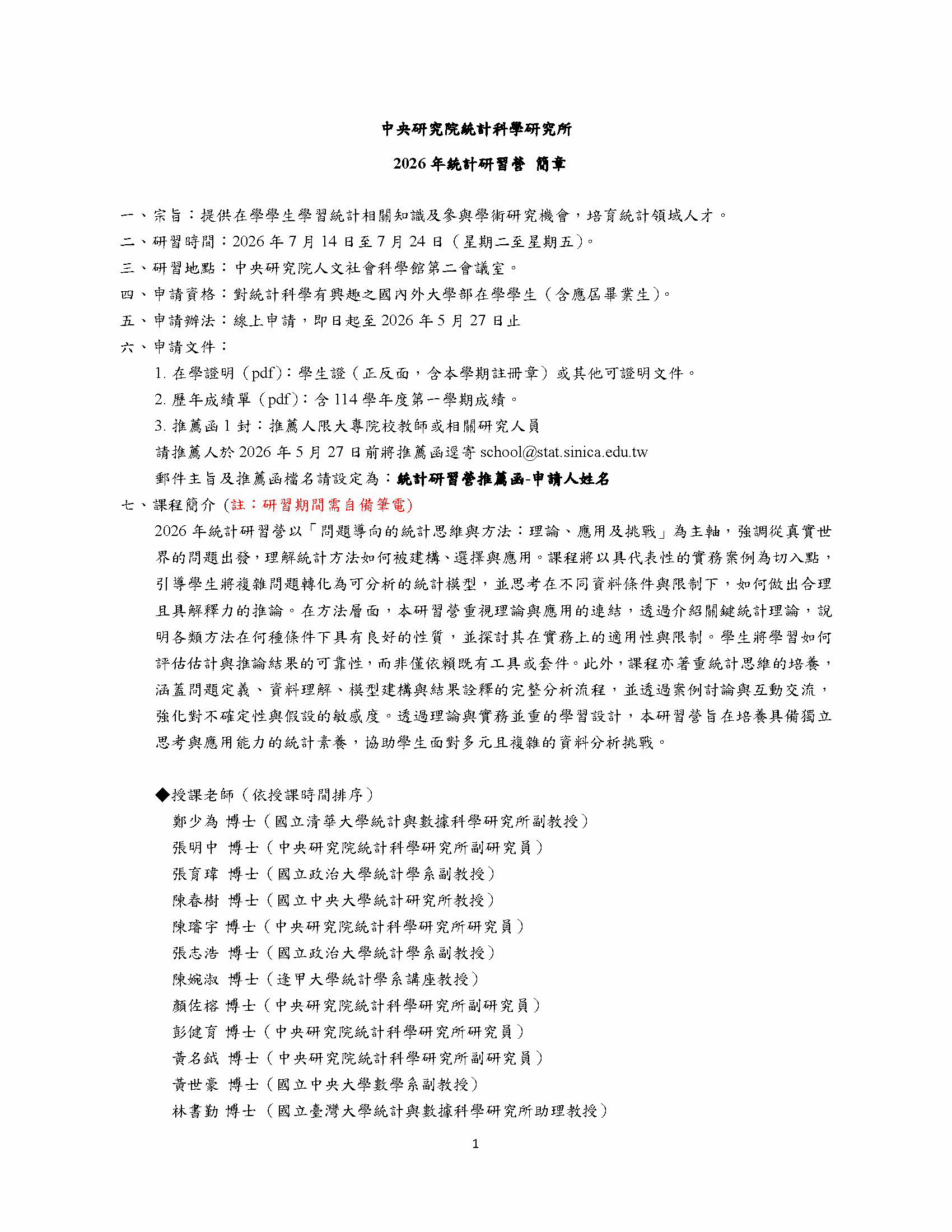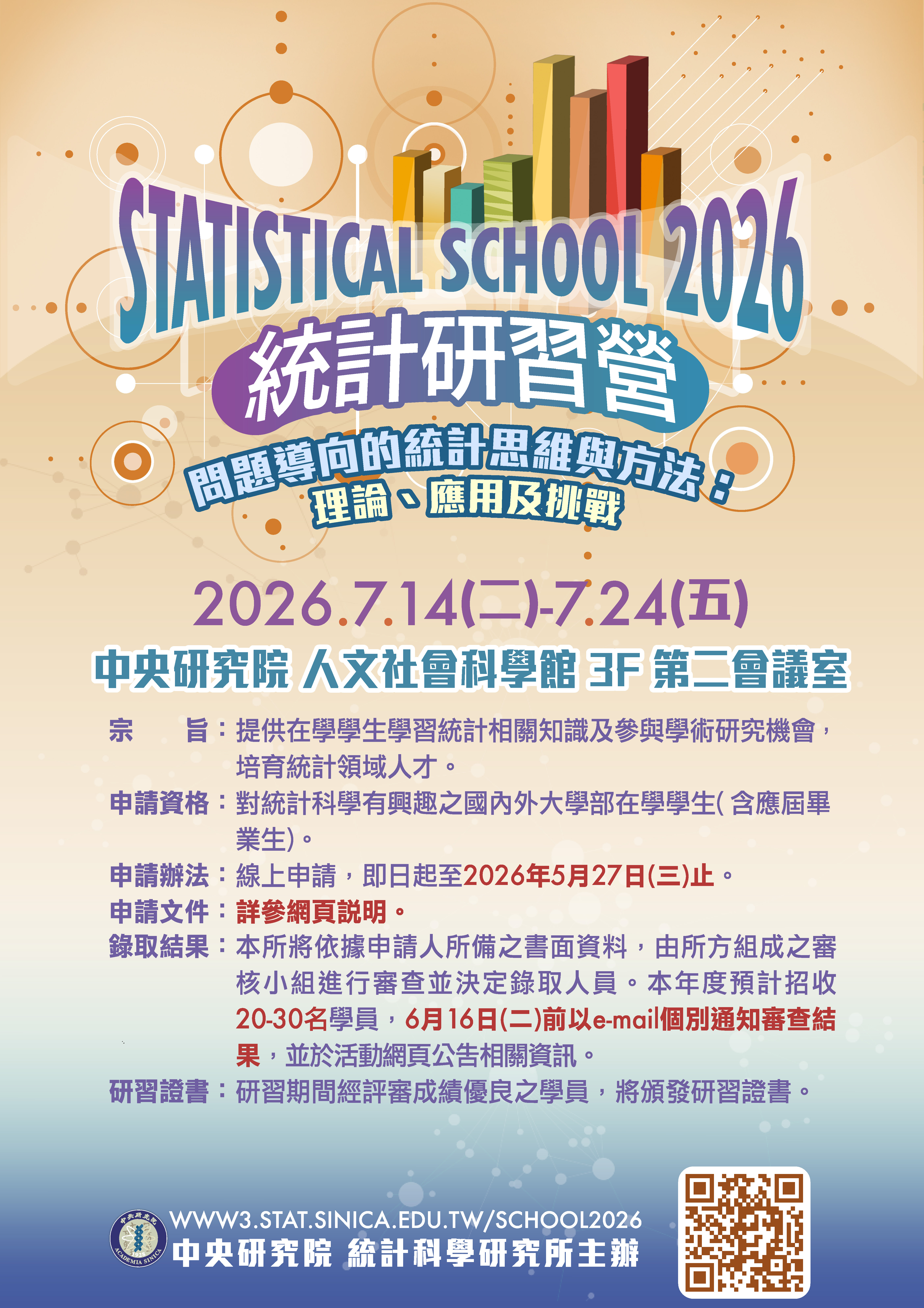 中央研究院統計科學研究所將於2026年7月14日至7月24日舉辦「2026統計研習營」,本次研習營以「問題導向的統計思維與方法:理論、應用及挑戰」為主軸,強調從真實世界的問題出發,理解統計方法如何被建構、選擇與應用。課程將以具代表性的實務案例為切入點,引導學生將複雜問題轉化為可分析的統計模型,並思考在不同資料條件與限制下,如何做出合理且具解釋力的推論。自即日起至2026年5月27日接受報名,相關簡章及海報詳情請參考附件。更多活動資訊,請參考網頁:https://www3.stat.sinica.edu.tw/school2026/ 。